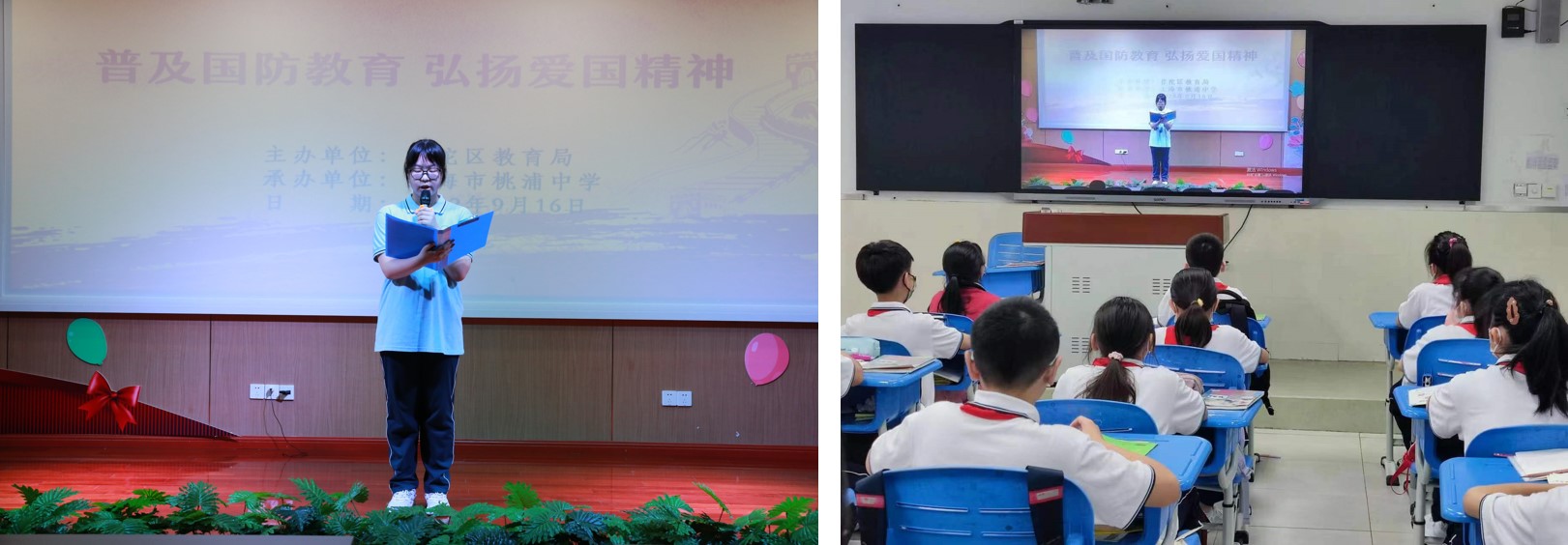 每年9月的第三个星期六是全民国防教育日,是国家设定的对全民进行大规模国防教育的主题活动日,同时这一天还是全市防空警报试鸣日。在普陀区教育局指导下,桃浦中学于2022年9月16日对全校师生进行了主题宣传活动。